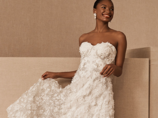 Clusters of beaded floral appliqué add texture to this midi tulle wedding gown, while intricate metallic embroidery creates a sparkly effect. If you're planning to do a second look, this enchanting number makes for the perfect reception dress.