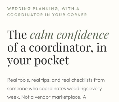 AisleCalm is a digital wedding coordination platform designed specifically for couples who want to plan their own wedding in Quincy, CA, without feeling overwhelmed. Created by a real, working wedding coordinator, AisleCalm brings professional expertise directly to couples through thoughtfully designed tools, timelines, and personalized guidance all in one place.