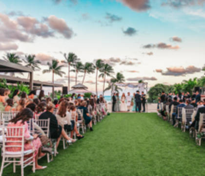 The venue can accommodate several hundred guests and has a selection of indoor and outdoor event spaces. You can say "I do" at the hotel's private beach, an idyllic setting that boasts unblemished vistas of the sea and Millionaire's Row. Removed from Miami Beach's hustle and bustle, this space has a tranquil atmosphere perfect for exchanging vows. Ceremonies can also be held at the Garden Terrace. Overlooking the ocean, this event space combines immaculate scenery with comfortable facilities. Our Sky Deck is another great place to hold your ceremony off the beach, but it still provides an oceanfront view. Located directly off of our Orchid ballroom and terrace, the Sky Deck has ample space that can also be used for an outdoor reception. Should you opt for an intimate service, the poolside area is a suitable option. Replete with chic décor and ambient lighting, this ballroom is the definition of class and is perfect to fit every bride's unique vision. For your memorable wedding photos, The Alexander couldn't be a better choice. And the best part? We are a unique, all-inclusive venue. This means we provide you with everything you need to create your perfect day!