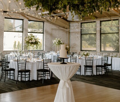What was formerly Baker Furniture Warehouse has been reimagined as a spectacularly modern event space. This premier wedding venue is home to two unique settings. Located on the main floor, the Warehouse still features the exposed white brick walls of the iconic Holland landmark. The vaulted ceilings and large windows provide an abundance of natural light. It also features a dance floor, bar, and a large adjoining terrace. Café lights and additional seating with outdoor heaters are also available. Upstairs, the Loft showcases the same urban charm and is ideal for a smaller gathering. This intimate setting features wood floors, wood beam ceilings, oversized windows, and custom-made wooden tables. The glowing bubble lights add to its welcoming and cozy atmosphere. This expansive venue is very versatile and accommodates up to 300 guests.