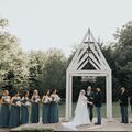 Bethel Rock is family-owned and -operated and was first established as an event space in 2018. The team has hosted an array of events over the years, from engagement photo sessions to romantic receptions. Your day will start in the two get-ready suites, the Bridal House and the Groom's Game Room, to prepare for the altar alongside your nearest and dearest. You can then make your way to the outdoor ceremony site, affectionately named The Chapel. Lush trees and plants surround the stone-lined aisle and wooden altar, making for a picturesque backdrop as you say, "I do." You're also welcome to use the Viewpoint, Which overlooks the horizon, providing a panoramic sight for your big day. After your guests enjoy their cocktail hour on the open-air patio, they can gather in the indoor reception area. Exposed red brick and glass garage doors surround the space, providing both a rustic atmosphere and plenty of natural light. A large wagon-wheel chandelier hangs from the vaulted ceiling, covering your celebration in a warm, romantic glow.