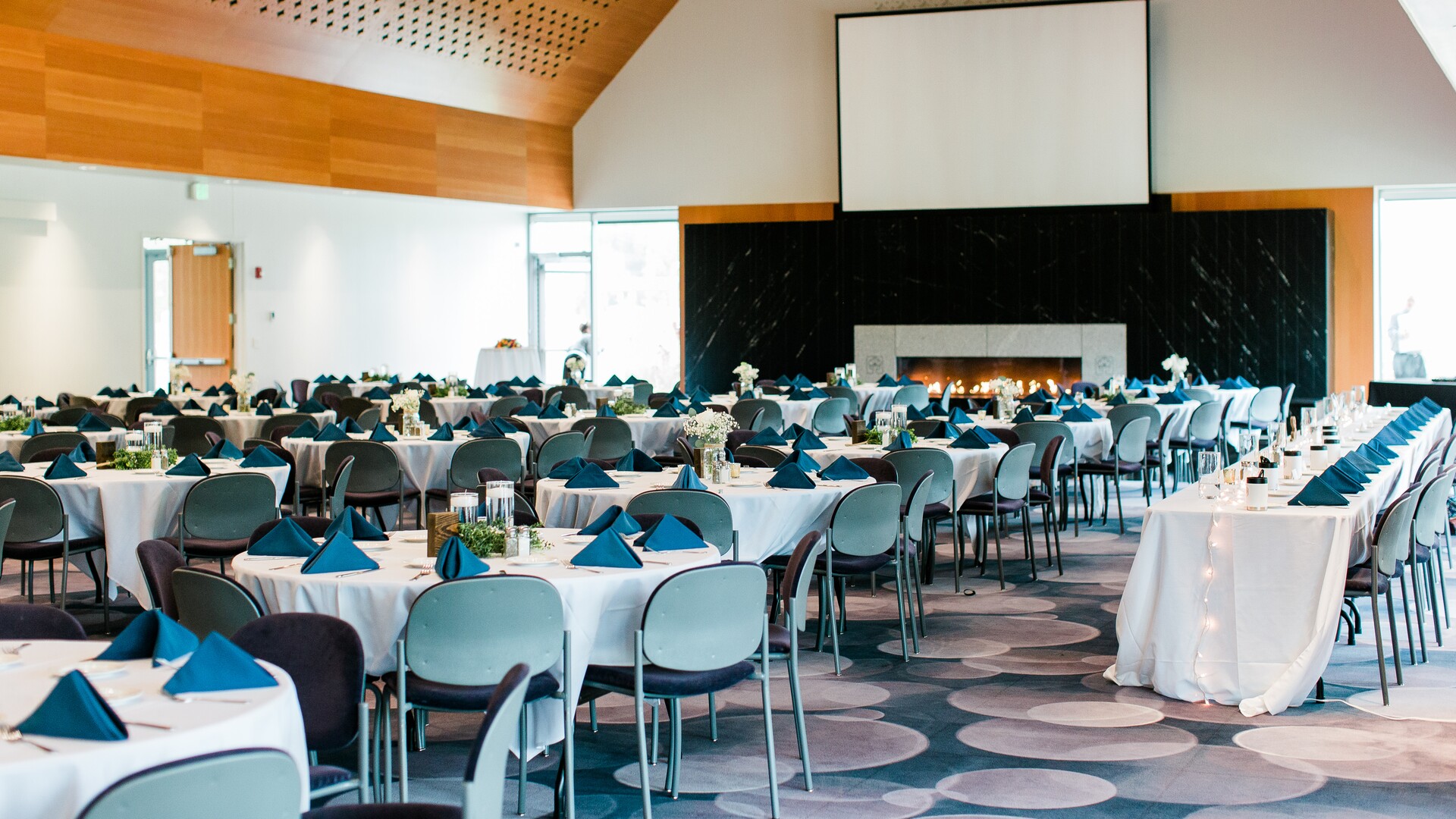 With optional A/V equipment, a built-in dance floor, cozy fireplace, and access to a scenic outdoor patio, the space is designed to meet a wide range of event needs. A fully equipped catering kitchen and built-in bar make it easy to host anything from casual buffets to elegant plated dinners.