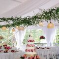 The floral ring over the dance floor with the hanging lanterns was a showstopper, and the greenery throughout the reception tent added such a magical touch. The flowers on the awning and custom monograms outside were the perfect details that tied everything together.