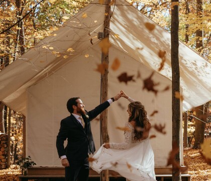 Emmerich Tree Farm specializes in hosting outdoor ceremonies and receptions. Couples can exchange their vows in front of a handcrafted wooden arbor, while guests admire the views of the Warwick Valley. The pavilion is an elegant setting for receptions and can accommodate up to 160 guests. This building was crafted using lumber milled from the property and offers a chic rustic aesthetic. As day turns to dusk, guests can enjoy the warmth and cozy ambiance of the fire pit.