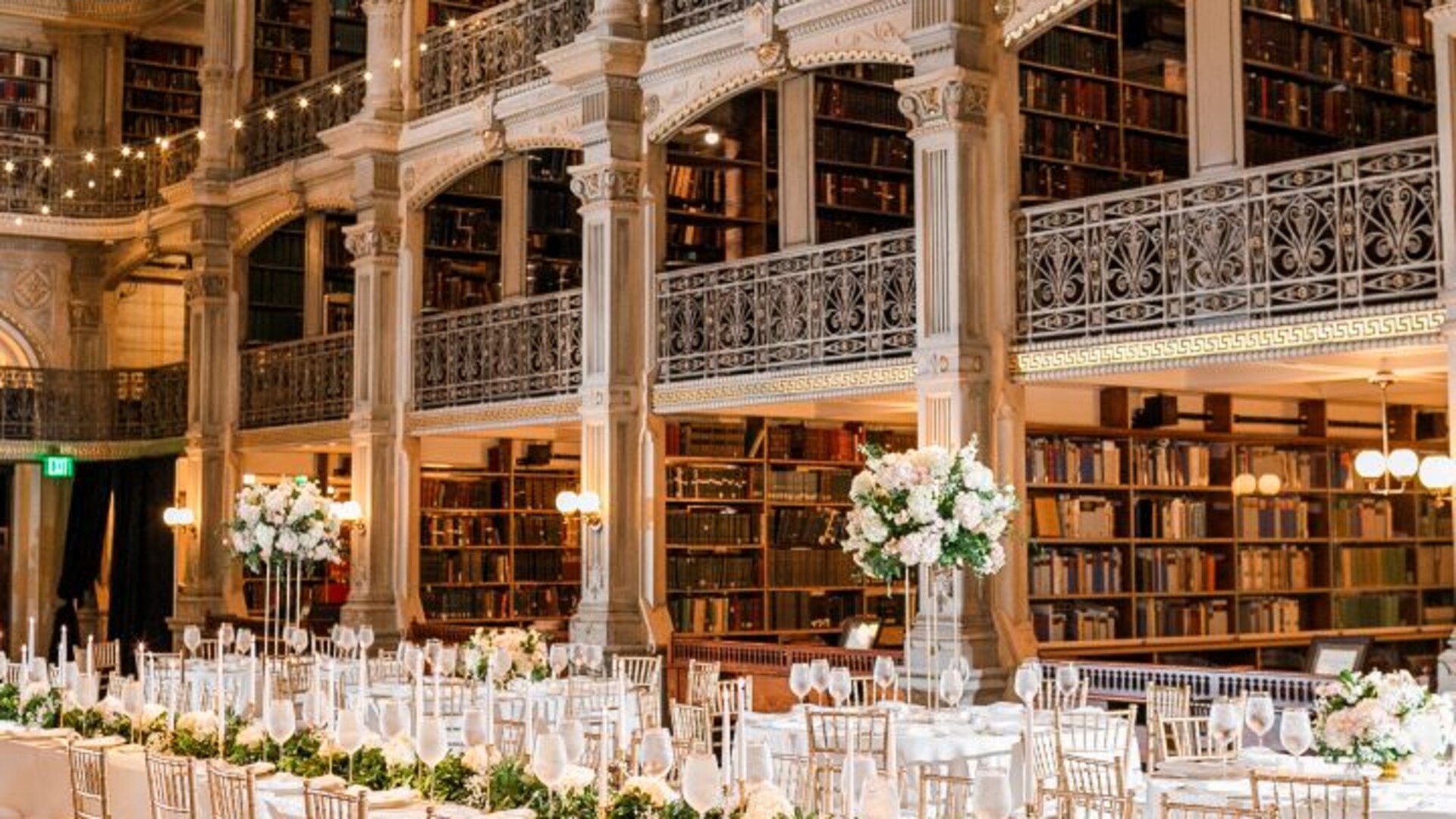The George Peabody Library, housed in the world-renown Peabody Institute of Music, is part of the Sheridan Libraries at the Johns Hopkins University. In addition to its use as a research library, the George Peabody Library has now become the premiere wedding and event venue in Baltimore.