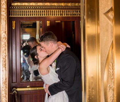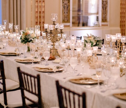 The hotel features five distinctive event spaces, including an outdoor garden for open-air ceremonies and elegant ballrooms for receptions. The iconic Crystal Ballroom, with soaring ceilings and glittering chandeliers, hosts up to 400 guests in a stunning setting. The Empire Ballroom, inspired by 19th-century French design, features a tiered layout, rich wood accents, and gold leaf details that create a dramatic backdrop for your day.