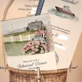 n in law fell in love with Josie's work and hired her to have the watercolor of the Inn on their Save the Dates. It set the tone for the wedding. When it came time for the invitations, my daughter found inspiration from an English garden wedding invitation. She knew this was a look she would like to recreate. Josie worked with us to create a unique wedding invite that was used to inspire and create a beautiful floral toile with love birds as a crest. Josie suggested a lily of valley stamp to add to the vellum wrap. It was done is a soft sage green. We used the crest and toile/birds throughout the wedding day. Josie created ceremony programs, napkins, menus, escort cards and wedding signage with this theme. We were able to use the crest on plastic cups and some other items we created. Instead of a wedding guest book, Josie had the the watercolor of the Inn made into a poster for guests to sign so the bride and groom will now be able to frame it and hang in their home for keepsake! Josie was a pleasure to work with, was on time and responded quickly. (Photos by Mary Dougherty Photography)