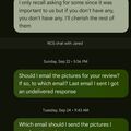 Me, Client (C ): Should I email the pictures for your review? If so, to which email? Last email I sent I got an undelivered response