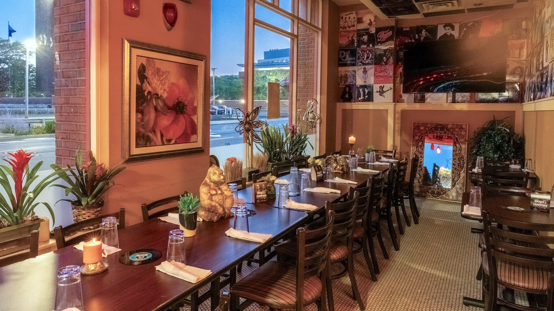 Jazzy's Cabaret has multiple spaces so that couples can tailor their event to their unique wants and needs. George St. can accommodate up to 22 people and features large windows and ambient lighting. Fun and floral, the garden room is ideal for a romantic soiree with up to 40 guests. Another option is the main dining room, which is the largest of the spaces and has a capacity of 60 people. Checkered earth-toned floors, eye-catching artwork, and a stage at the focal point create an inviting setting for any occasion. This venue is designed for live music, so you can have your favorite musician perform at your celebration with ease.