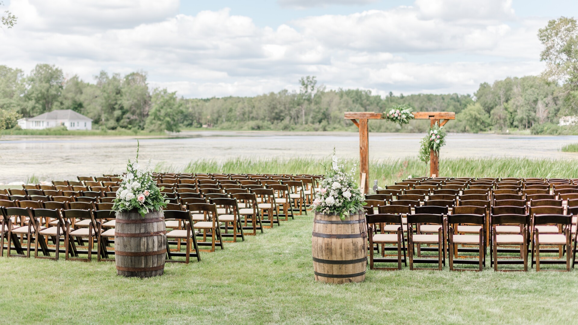 Olde Mill Lodge completes the experience with accommodations for up to 18 guests, including two separate bridal suites, each with full bathrooms, mini bars, and TVs. The romantic wedding suite is perfect for the newlyweds to spend their wedding night. The Lodge also serves as our outdoor waterfront ceremony site, with seating for up to 300 guests overlooking the scenic Mill Pond.