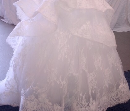 g that needed to be taken care of. I had the option to have it boxed for preservation. Upon pickup my Maggie was ready and hanging for inspection. I am quite certain it was even more beautiful than when I wore it! Sally did a wonderful job cleaning and mending the three spots where the lace ripped. She is so sweet and takes care of everything, there is no need to worry with Sally!