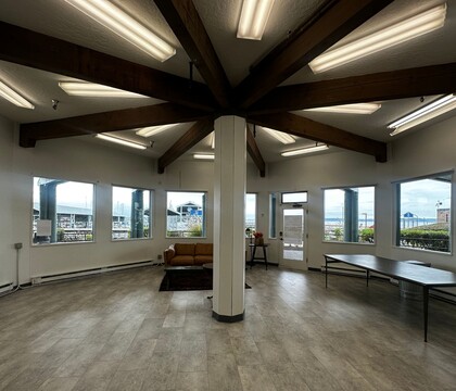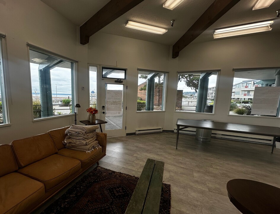 The eye-catching venue is ideal for intimate private dinners, workshops, brand pop-ups, wellness classes, off-site meetings, events, and photo shoots. With white walls, warm wood flooring, and large front windows looking over the marina and Puget Sound, the space fills with natural light during the day and transitions easily to a candle-lit atmosphere for evening events.