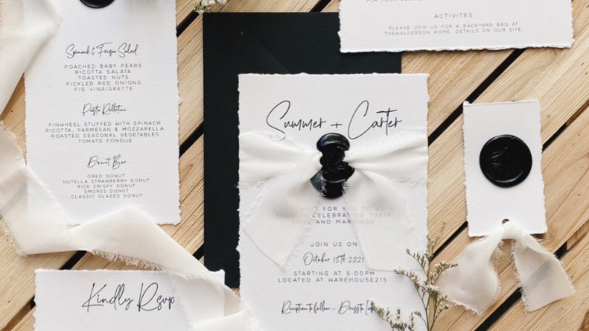 Paper and Petals is familiar with an array of styles and can accommodate various color schemes and design visions. In addition to stationery, Madie is happy to provide day-of signage options. These include menus, seating charts, table numbers, programs, and more. Madie is skilled in calligraphy, embossing, engraving, and letterpress techniques, allowing your event's aesthetic to be completely personalized.