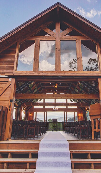 Couples looking for an outdoor setting can opt for Mountain View Falls. This area can host up to 80 guests and has a waterfall for those picture-perfect moments. The pavilions all have adjoining cabins for guests to experience an overnight mountaintop stay. The lodging allows loved ones to unwind and take advantage of the resort’s ample amenities the morning after. Attendees can look forward to the year-round indoor pool, an outdoor pool, family cabanas, fireplace tables, and an 18-hole golf course, to name just a few.