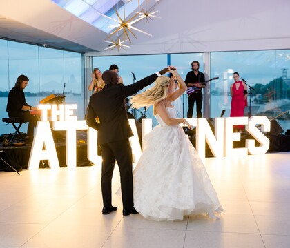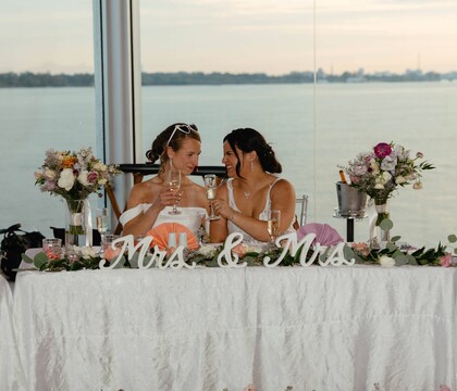 Roostertail has more than 25,000 square feet of space for you to transform, with floor-to-ceiling windows that overlook the river and the city skyline. There are three event spaces to choose from and two outdoor ceremony sites. You can exchange your vows on our waterfront Deck or Side Patio with beautiful views of the boats going by in the backdrop. An intimate reception can be held in the Club, which has a maximum capacity of 60 guests. Our Marine Room, which welcomes between 50-215 guests, has a hydraulic dance floor to wow your guests during your first dance! Our largest space, our Palm River Room, welcomes between 125 and 450 attendees, with floor-to-ceiling glass overlooking the Detroit River. There is plenty of free on-site parking for added convenience. Lots of event items are provided, including linens, customizable LED lighting, and Chiavari chairs. There's also an event coordinator on hand to help you with any questions you might have.