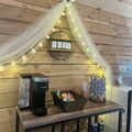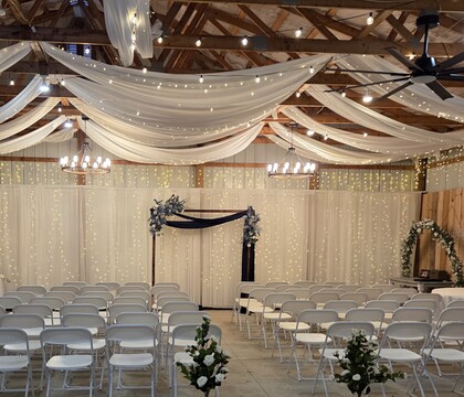 Imagine saying “I do” under the canopy of mature trees in our wooded ceremony space, complete with lantern-lined aisles and serene seating. Then, stroll to your reception in the courtyard or barn—where Edison string lighting, farmhouse tables, and lush greenery walls set the mood for an elegant yet laid-back celebration.