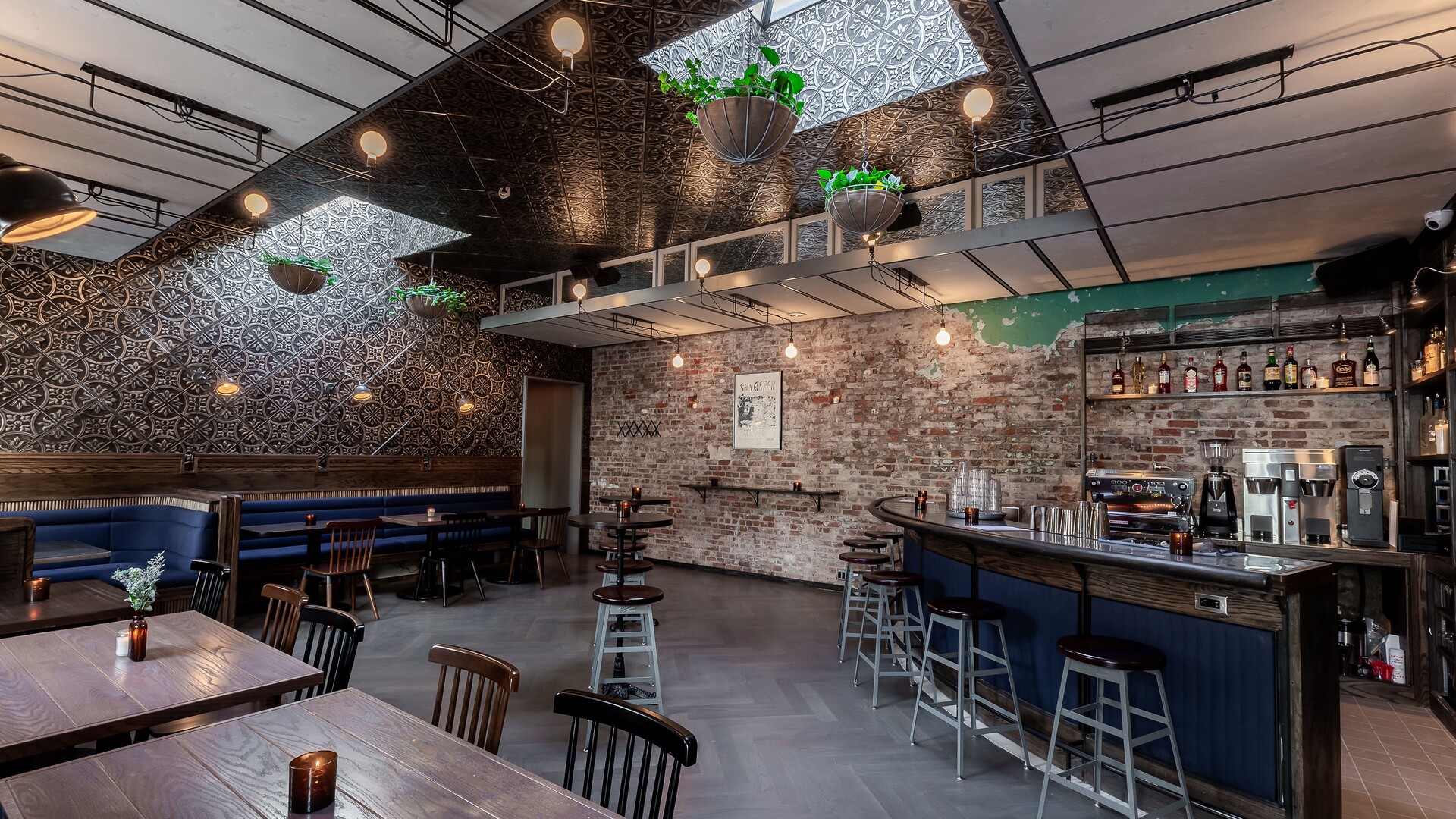 A beautifully designed venue located on the corner of Lorimer & Frost Streets in the heart of Williamsburg. This neighborhood bar & restaurant offers two stunningly designed rooms with plenty of natural light. The Frost Room is the perfect setting to celebrate, this former dance hall has been reimagined into a warm and welcoming venue featuring two large skylights, deep blue banquettes and a tin ceiling. Proprietor Michael Krawiec handpicked all elements of the venue down to the artwork. The Frost Room can host 65 guests for a cocktail party, or a full rental of Frost & Lorimer Rooms can accommodate parties of up to 180 guests. Come celebrate with us!