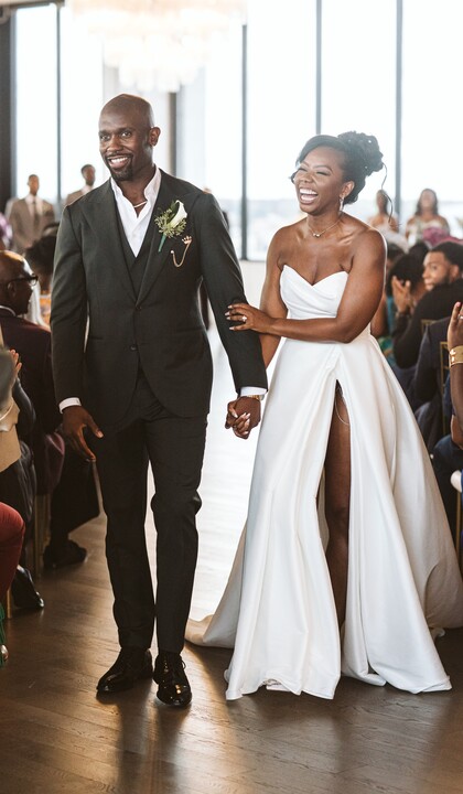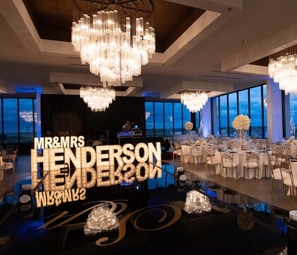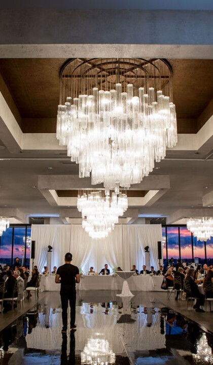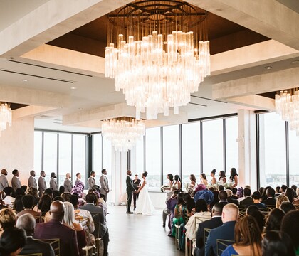 Working with Lesley was so seamless. We started working with her soon before the venue opened up, and we were given multiple tours as the venue was being fully put together. The vision was there the first time we took our first steps on the venue floor, and it blew our expectations out of the water by the time the venue was fully complete for events. The 270 degree view of the airport and surrounding area gave the venue a feeling of life and possibilities as well as access to the bridal suite and rooms for close family on the 9th floor was really convenient. It was so spacious, 250+ people could easily enjoy an event here (we had around 180). We had the ceremony on the 9th, cocktail hour on the first for the reception to be set up, and then the rest of the night was on the 9th. The sunset was gorgeous and the chandeliers really stood out to us. We really wanted the “elegant minimalistic” look, and we found it in spades. Lesley worked with our other vendors (DJ, Binny’s, we did DIY flowers) and had no hiccups during the course of the weekend. She was responsive, lovely to get to know, and was the point person for the entire year we spent planning the event.