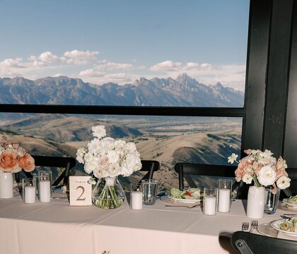 Ceremonies take place outdoors in our tiered summit amphitheater, surrounded by alpine beauty and breathtaking mountain scenery. Receptions follow at the Summit House, our modern three level venue featuring floor to ceiling glass windows, a rooftop terrace perfect for cocktail hour, and Aurora Restaurant, our elegant, glass enclosed event space with panoramic views of the Tetons and valley below. The space comfortably accommodates up to 200 guests and can be thoughtfully designed for intimate gatherings, full seated dinners, or elevated cocktail style celebrations, including larger guest counts depending on event format.