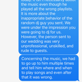 at with our ceremony music. The reception went well but our first dance as husband and wife was cut short and they didn’t really stick to our playlist that we had sent in.