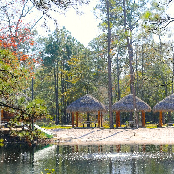 Starshine Texas caters to all tastes. On the property, you can choose to host a beach wedding, a ceremony in the courtyard, or rustic lodge celebration. The beach site features a lakeside area complete with sandy shores where you can exchange your vows. There are three Tiki huts where you can enjoy an intimate reception, as well as an authentic Tiki bar. Intimate affairs or elopements will find their place at this spectacular location. Alternatively, you can choose a classically romantic courtyard service. Here, your aisle is mapped out by a striking stonework path, leading you to a gazebo structure notable for its sculptures. This will create a memorable backdrop against which you can say, “I do”. Following this, you and your guests can enjoy a garden reception on the well-manicured lawn. You can also opt to hold your ceremony and reception in the lodge, a space characterized by its warm, rustic woodwork features. The open-plan layout allows plenty of room to celebrate your ceremony and reception with ease. There is also a porch where you and your guests can enjoy a cocktail hour, overlooking the tranquil views of the property.