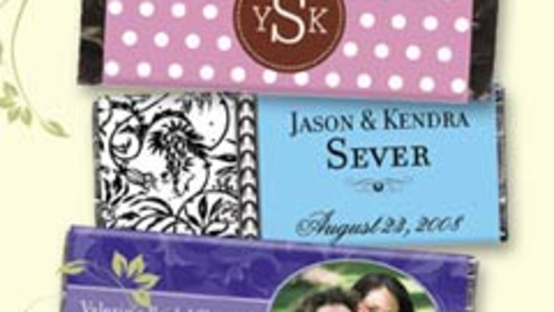 Custom-wrapped candy bars make truly unique favors! Perfect for receptions, engagement parties, bridal showers and rehearsal dinners. Choose from our large selection of beautiful designs and color options OR create your own! ~ We specialize in professional design service and exceptional customer service.