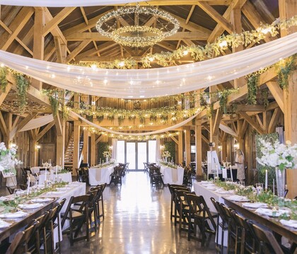 The Heartwood Barn utilizes time-honored craftsmanship and features created by local artisans. This climate-controlled masterpiece constructed in 2015 boasts 30-foot ceilings, an expansive covered back porch, bridal suite, groom's room, kitchen, central heat and air, string lights, greenery, draping, and massive hand-carved beams sourced from across the U.S. Opening to picturesque views of rolling pasture with a breathtaking outdoor ceremony location at the majestic 200-year-old sycamore tree, the peaceful ambiance and timeless beauty of this venue will heighten the romance of your wedding day experience.