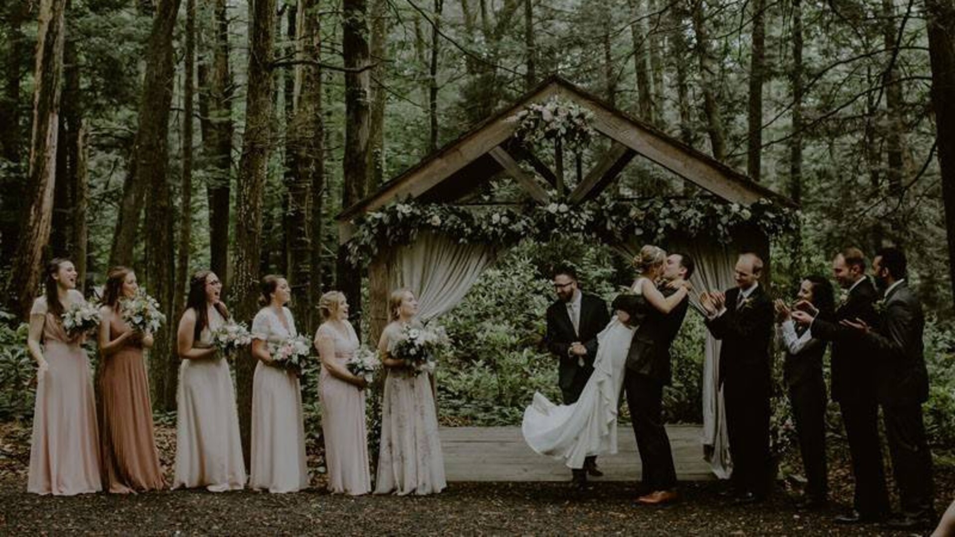 As soon as we arrived, we knew this was the perfect place for our wedding. The setting is rustic yet charming, tucked among the forest and rhododendron thickets of the Poconos, which created such a beautiful backdrop for photos. The day was more magical than we ever could have imagined. We also loved having access to a private “getting ready” cabin, which made the day feel even more special.