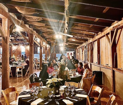 The origins of this beautiful barn setting date back to the 1800s, with the original style and character of the building still shining through today. With the original Homestead and the Settlement Stagecoach Station still standing on the grounds, The 1850 Settlement has an unlimited capacity for its outdoor area. The spacious lawns are suitable for ceremonies, cocktail receptions, and yard games. The outdoor fire pit and lounge seating area mean that guests can relax under the ground's impressive oak trees. Soft, ambient lighting throughout the venue creates an intimate and romantic atmosphere for couples to celebrate their love. The large barn can accommodate 300 guests for a seated dinner and 250 guests for a buffet, and the open floor plan of the indoor area means that many layouts can be arranged on the wedding day.