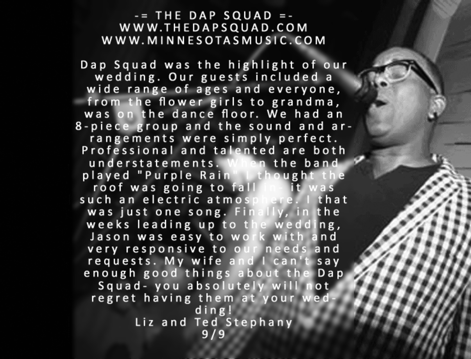 LOOK NO FURTHER, YOU HAVE FOUND THE BEST LIVE BAND IN MINNESOTA. This band and their management are OVER THE TOP and pure MAGIC!!! Dap Squad is completely professional and provides...