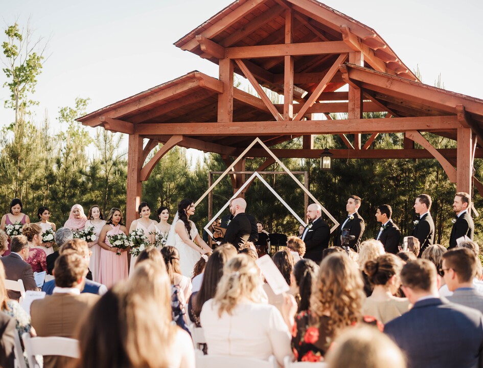 Designed to host up to 250 guests, the handcrafted 7,200 square foot pavilion features warm wood tones, cedar details, and an inviting atmosphere for both ceremonies and receptions.
