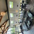 Main dining area - A 90-feet by 36-feet space with glamorous warehouse chic design, featuring a tall glass wall, cathedral ceilings, modern crystal chandeliers, and state of the art kitchen.