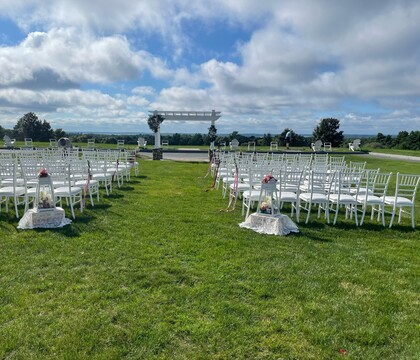 The Vue has both indoor and outdoor spaces to choose from for your celebrations. The venue's private room seats 140 guests and boasts a customizable 3,600 square feet with dark wood floors and lavish white wainscoting, providing the ideal foundation to add your décor. For an outdoor occasion, you can decide to host your reception on the magnificent lawn, adding something special for a summertime wedding. You can exchange vows under the gorgeous white arch, overlooking lush forestry and the carefully manicured grounds.