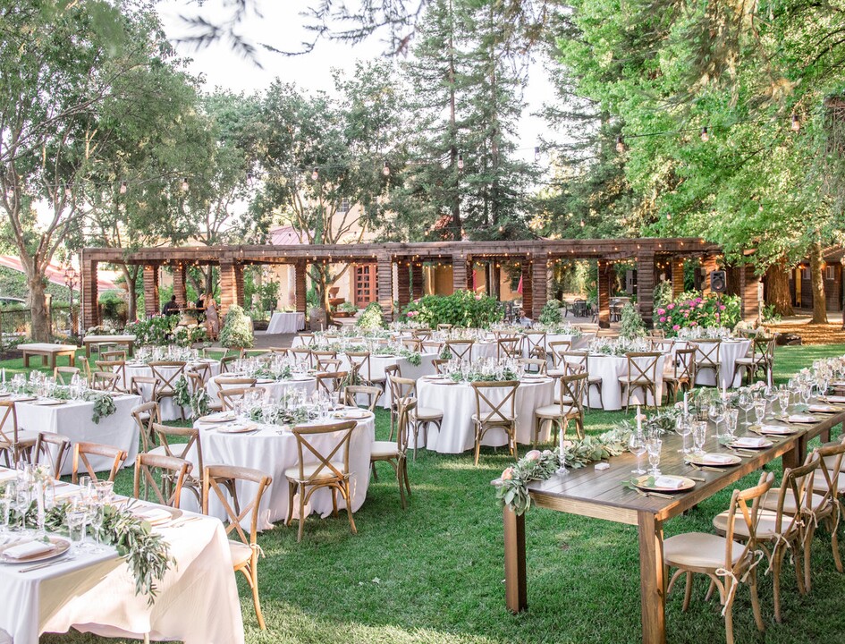 Couples can say their vows in several beautiful locations dotted along this old-world Italian vineyard framed by redwood trees and a picturesque vine-covered arbor. The North and South Lawns are ideal for outdoor ceremonies, boasting views of the Mayacama Mountains in the background. Newlyweds and their beloved guests can dine beneath the starry sky at the Grape Arbor reception space. Or, if couples prefer an indoor setting, the Sala de Leon Pavilion, Storia Room, and South Arbor provide ample shelter for a night of dining and dancing. The maximum capacity for seated dining is 265 guests.