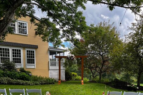 Let Stonewall Farm host your guests at our rustic elegant timber frame building set in beautiful rolling farmland in scenic Keene, New Hampshire. Our two-story Grand Room opens out onto a beautiful pa