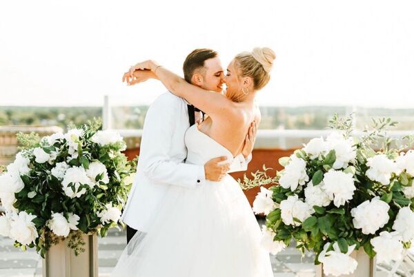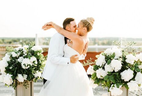 Above is a sophisticated rooftop wedding venue located in Staten Island, NY, connected to the Hilton Garden Inn. Newlyweds can enjoy a breath of fresh air atop the wraparound open-air terrace while en