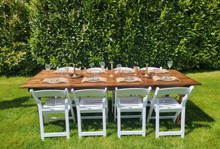 Rentals such as tables, chairs, cocktail tables, chair covers, linens, sashes, napkins, tableware party supplies, plates, glasses, silverware, chafers, vases, cake stands, wood signs, burlap, chalkbo