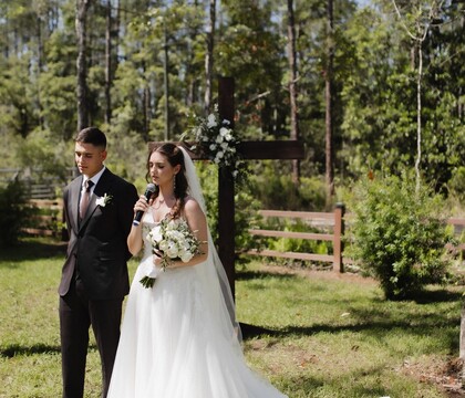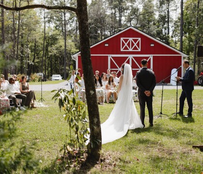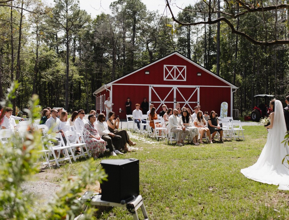 Whispering Pines Barn LLC is a stunning wedding venue located near Jacksonville in Callahan, FL, where rustic charm meets modern elegance on six acres of natural beauty. Our barn features French doors, sunlit windows, and cozy sophistication—perfect for intimate wedding ceremonies and receptions, with room for up to 100 guests and exceptional catering. Included with your booking are a number of thoughtful amenities, like tables, chairs, and audio-visual equipment for music and slideshows. Table covers can be arranged for an additional fee, and your catering menu can be customized for complete personalization. Above all, we help turn your dream day into a beautiful reality.
