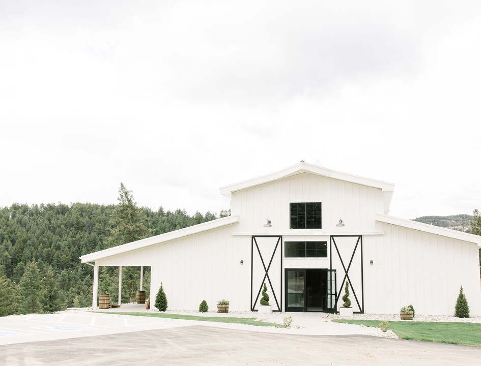 For your special day, Woodlands offers stunning views of the mountains, numerous spots to take pictures, and a beautifully manicured front lawn. The tall barn boasts a pristine white exterior and black trimming that creates a dramatic and stylish contrast. Two large sliding doors open to reveal an interior that features white-washed wood walls, black accent fixtures, vaulted ceilings, and modern chandeliers. String lights are draped throughout the cavernous space, which can accommodate up to 200 people for ceremonies, reception dinners, and dancing. The venue also includes an outdoor ceremony site, to which the Rocky Mountains provide a breathtaking backdrop. Afterward, you and your guests can gather on the covered patio to enjoy cocktails before dinner. Two get-ready suites are also available for you to prepare with loved ones for the big day.