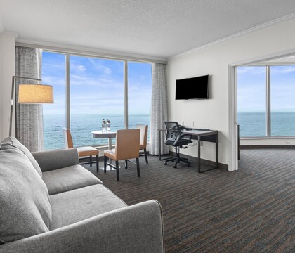 Your celebration continues with on-site accommodations, featuring 106 spacious suites ranging from studio suites to two-bedroom oceanfront suites. Each suite includes a private balcony, full kitchenette, and in-room washer and dryer, creating the perfect home-away-from-home for you and your guests. Couples and their loved ones can unwind in resort-style comfort with access to the outdoor pool and hot tub, ideal for pre- or post-wedding relaxation.