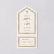 Layered details of scallops and fine line work create an elegant border around each all-in-one wedding invitation. Inspired by vintage celebrations, these antique-style invites highlight your custom serif monogram. Your names take center stage, followed by your event details, RSVP information, and even a link to your wedding website.