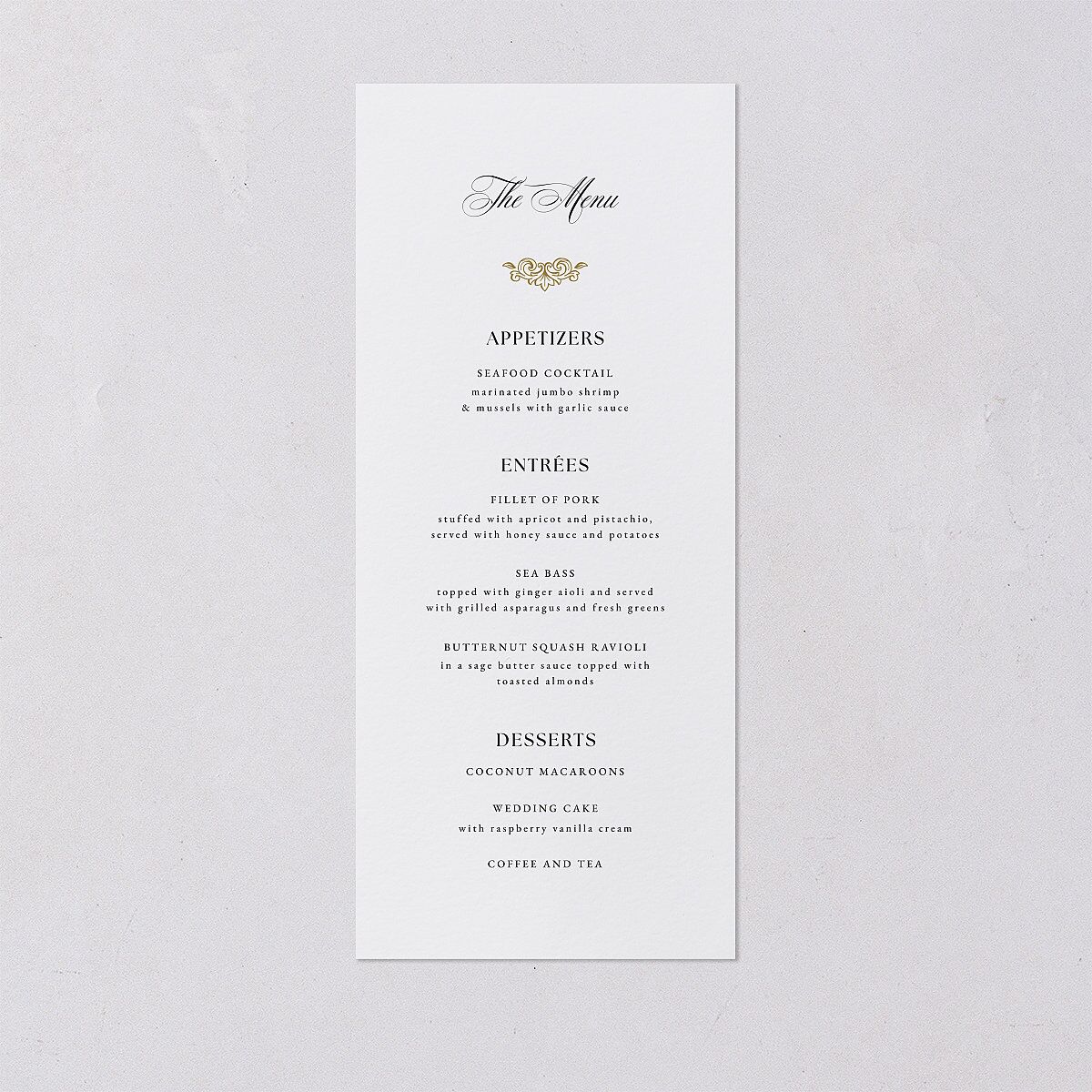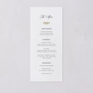 Add a finishing touch to your black tie reception. On this wedding menu, a crest-inspired flourish sits between "The Menu," which appears in script, accompanied by your carefully chosen courses printed in sophisticated serif. The reverse features your monogram against a solid background.