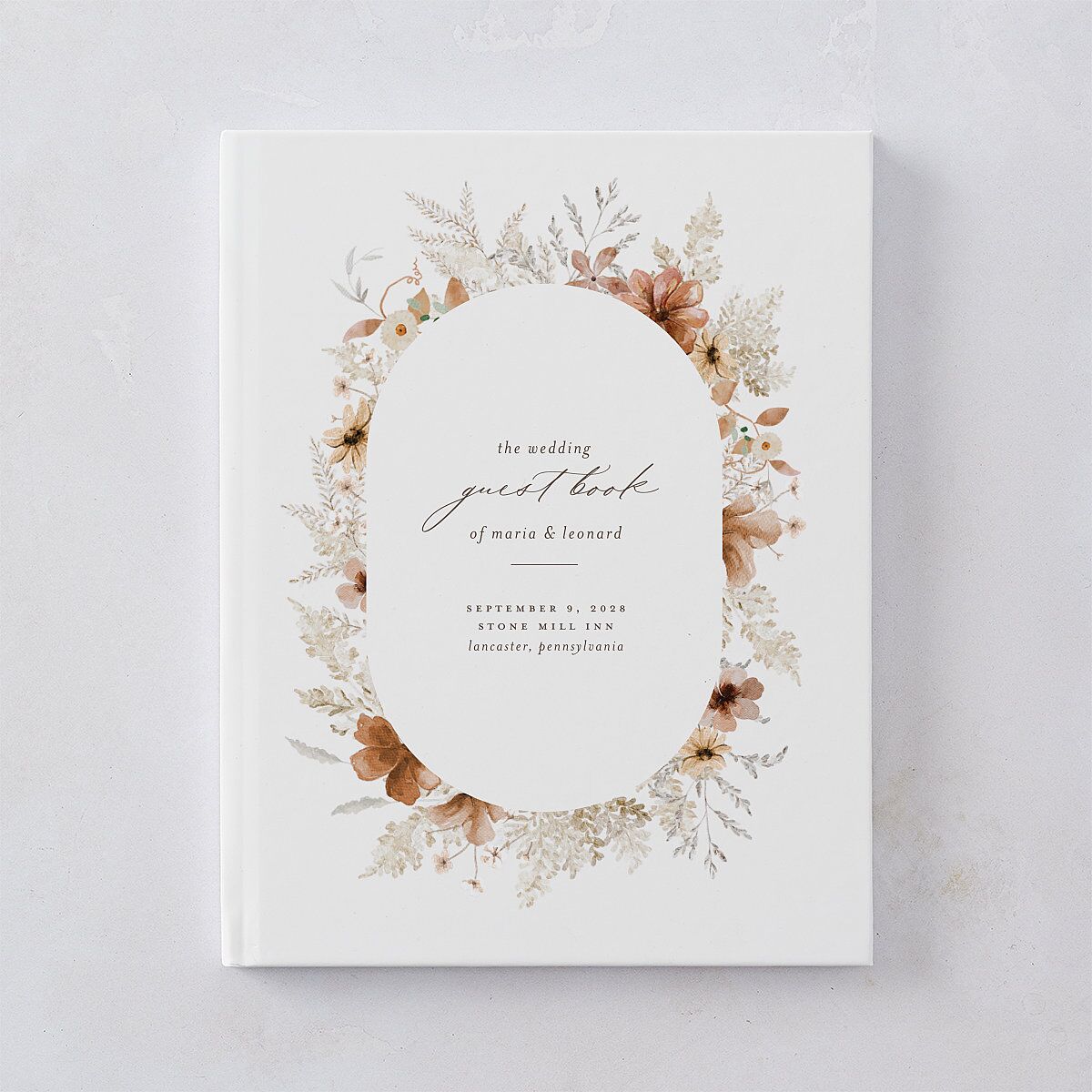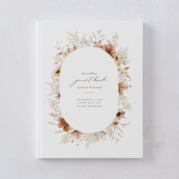 Encircled by delicate dried wildflowers, these wedding guest books feature an oval-framed silhouette that softly anchors the design. Your names are rendered in a gentle typeface, accented by serif and handwritten script for a personal flourish. The surrounding wildflower sketches offer an artful finish, capturing the spirit of a blushing bohemian suite.