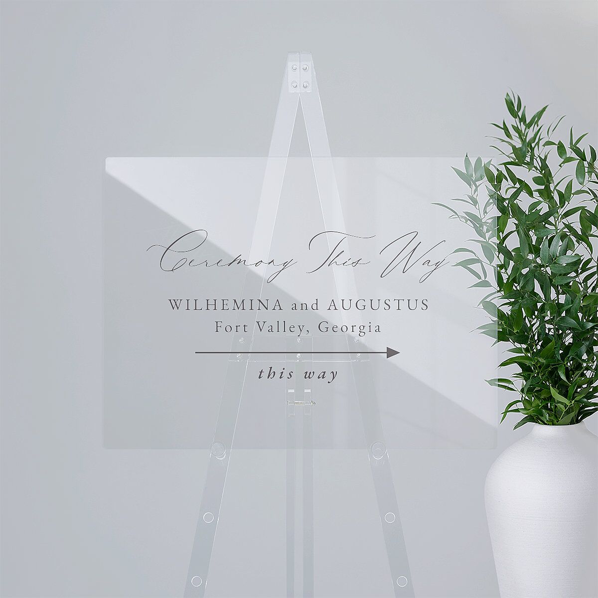 Orchard-inspired artistry frames each wedding direction sign. Guests won't lose their way to the celebration, guided by a cursive script that reads "ceremony this way," accompanied by your names and a directional arrow. The typography rests within a hand-painted frame of roses, foliage, berries, peaches, and oranges.