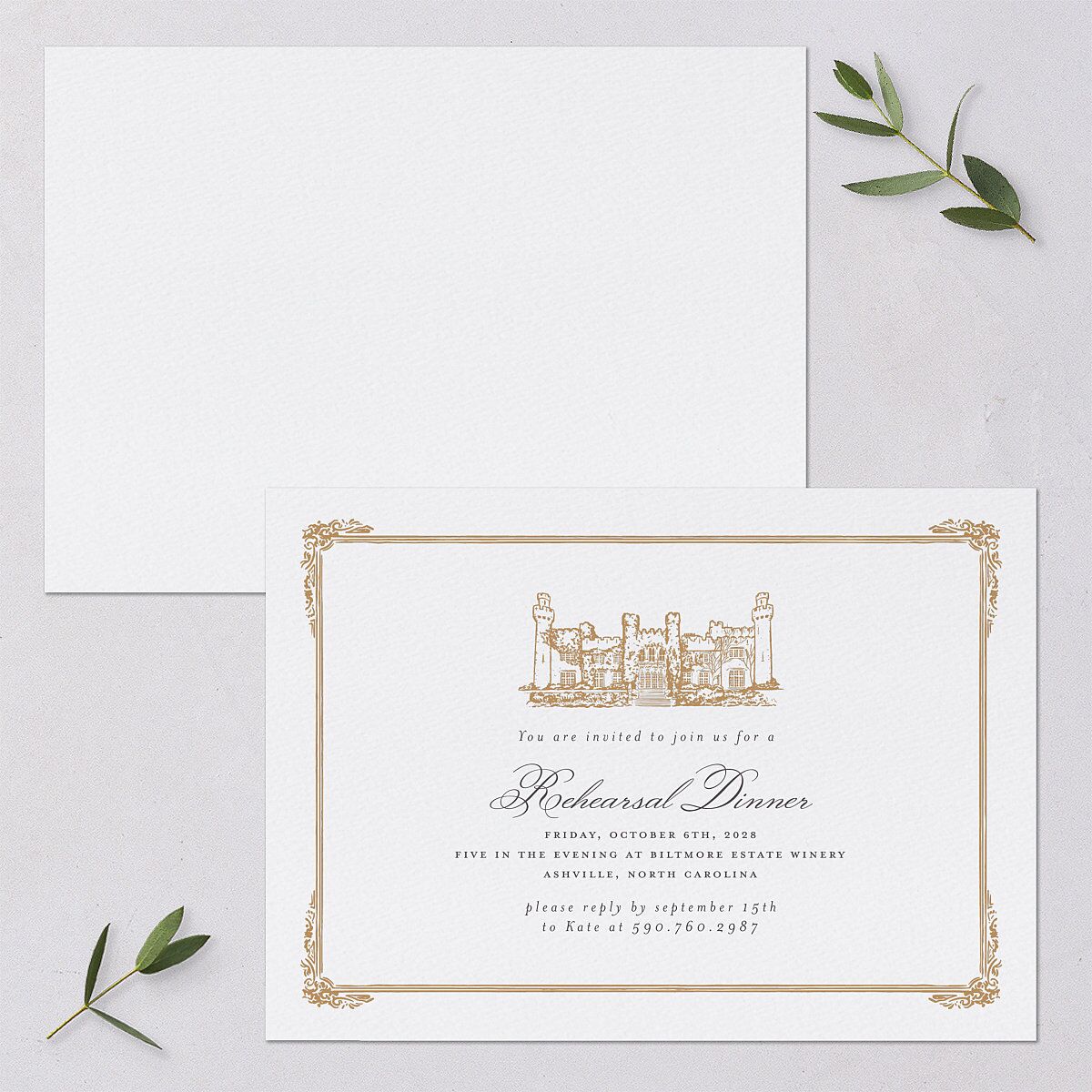 Create a charming experience with a set of elegant rehearsal dinner invitations. These invitations will impress your loved ones with a darling vintage frame and an artistic sketch of a grand estate. The rest of the design features "Rehearsal dinner" in cursive with your details in smaller typography below.
