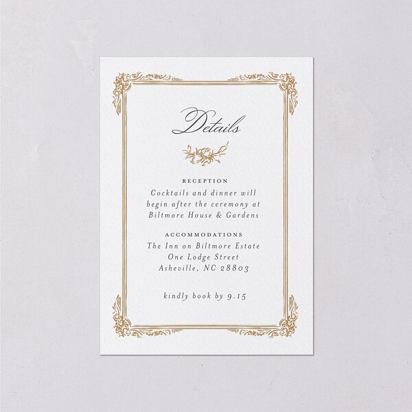 Keep your guests feeling welcome and happy about your charming celebration with this elegant and ornate wedding enclosure card. Displayed within a decorative frame, your event information appears beautifully in a selection of classic fonts.