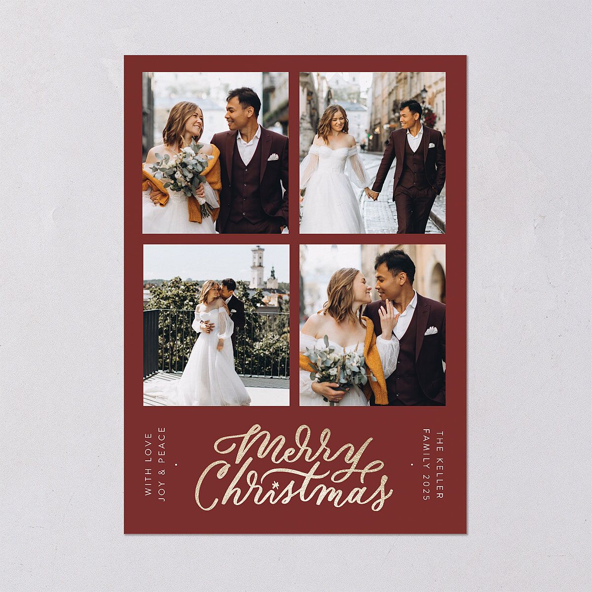 Make this a holiday season framed with love. Your four favorite photos are laid out in a grid-like pattern, bordered by your choice of a selection of rich colors. Below them, a “Merry Christmas” message glistens in foil script, with wishes of joy and peace on one side, and your family’s name on the other. The back of this holiday card has space for a heartfelt message set against a solid background in a pastel color to complement the front.