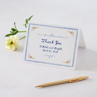 Your thank you cards are bordered with painted lines, decorated with floral designs in each corner. The center of your cards shows the words "Thank You," your names, and your wedding date, bracketed with playfully squiggly lines.