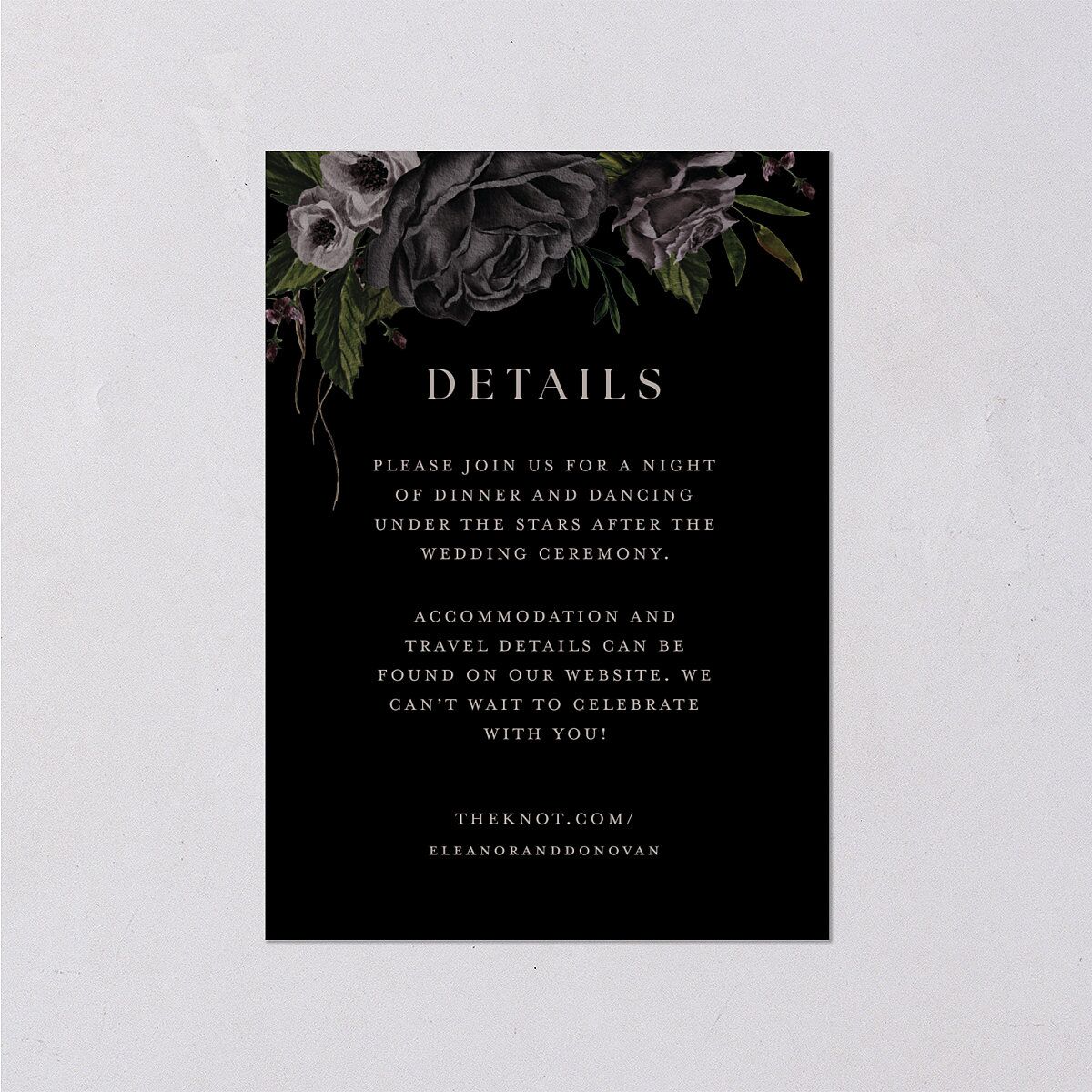 Hauntingly beautiful roses crown the top of these gothic-inspired enclosure cards, setting a darkly romantic frame for your celebration details. Elegant serif type lends structure to the text, while the back reveals a baroque damask pattern backdrop and swirling monogram accented by your wedding date.