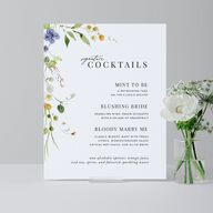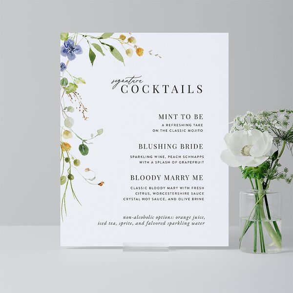 Dainty watercolor wildflowers bloom along the edges of these charming bar tabletop signs, with intricate green leaves and softly hued petals that evoke a natural, rustic elegance. The fonts—a blend of graceful script and refined serif—complement the whimsical artistry. The layout is airy and spacious against a plain background, perfectly highlighting text while nestling it beside a botanical frame.